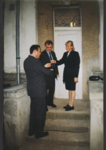 Dyrektor Szkoły nr 5 w Użgorodzie p.Petro Kindiuch w obecności Konsula Generalnego ze Lwowa p. Winsentego Dębickiego przekazuje klucze dyrektorce Szkoły Polskiej p. Tatianie Pułyk.